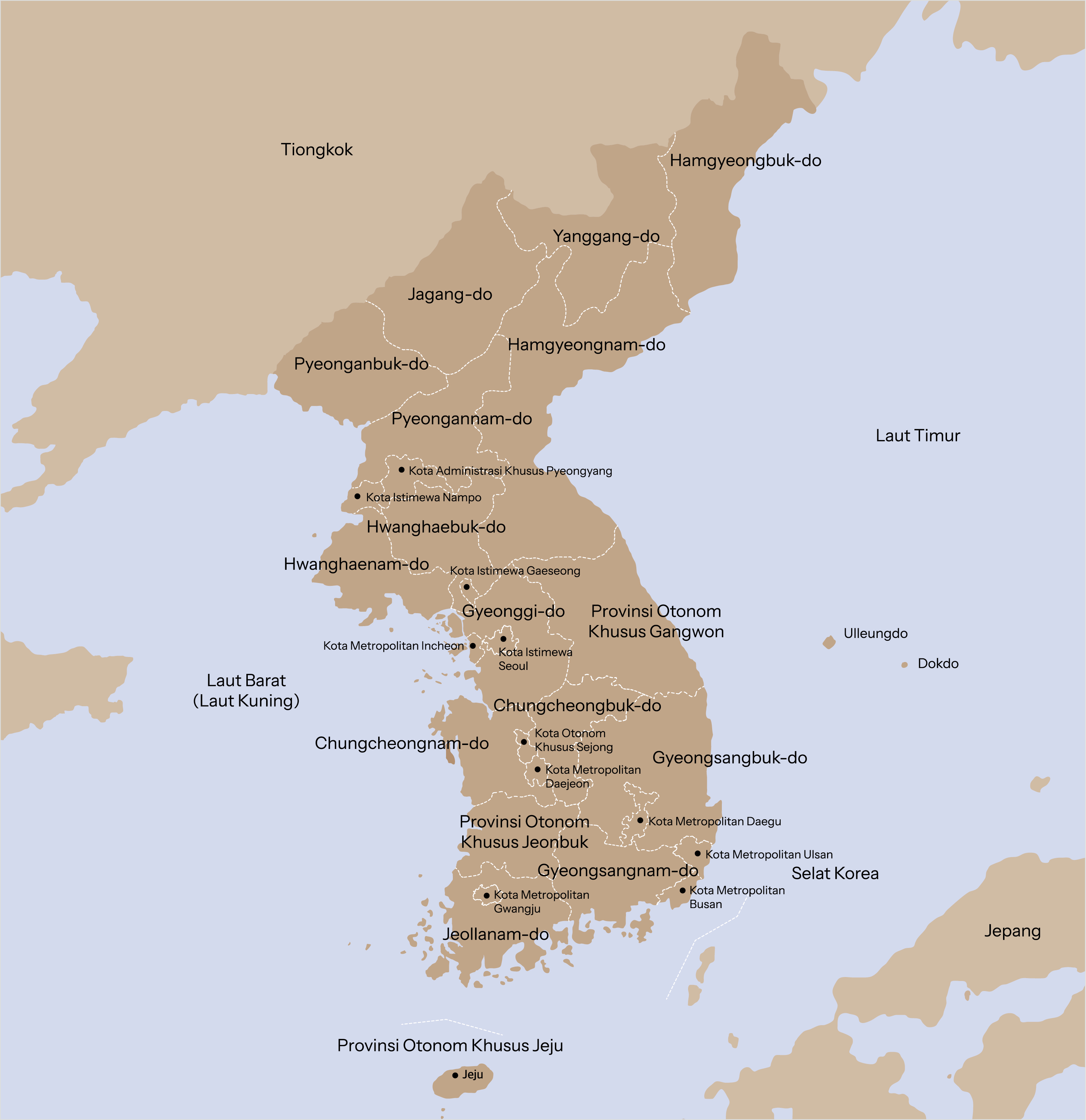 Secara administratif, Republik Korea terdiri atas 1 kota istimewa, 6 kota metropolitan, 1 kota otonom khusus, 6 provinsi (do), dan 3 provinsi otonom khusus. Pembagian administratif merupakan dasar penting dalam pembentukan identitas daerah sekaligus satuan dasar bagi penyelenggaraan negara yang efisien sehingga pembagian ini terus disesuaikan dengan perubahan zaman serta dinamika sosial. Seiring dengan pertumbuhan penduduk dan industrialisasi, sejumlah kota utama ditetapkan sebagai kota metropolitan, sedangkan penyesuaian administratif dilakukan dengan mempertimbangkan karakteristik daerah dan keperluan administrasi. Contohnya adalah Jejudo (2006), Gangwon-do (2023), dan Jeonbuk (2024) yang menjadi provinsi otonom khusus.