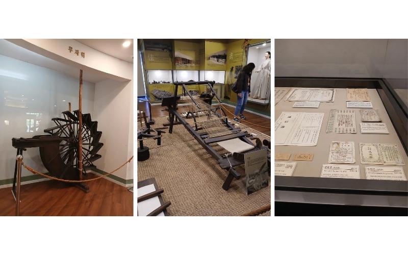 Mujawi (kanan) merupakan alat pertanian tradisional yang digunakan untuk irigasi. Beteul (tengah) merupakan alat tenun tradisional Korea. Beberapa koleksi sejarah dokumen identitas dan tiket (kanan) yang digunakan oleh rakyat Gimhae pada sekitar tahun 1940-1958.